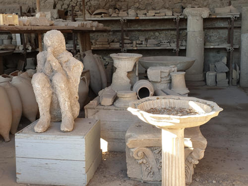 die Gipsmodelle der verschütten Menschen und Tiere.